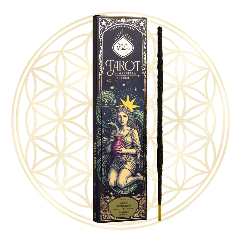 Edição de colecionador de incenso aromático da linha Tarot de Marselha. É uma coleção que respira mistério, arquétipos universais e a força do Olibanum (Incenso de Olíbano), que é a base de todas as fragrâncias desta série. Cada caixa inclui uma fragrância exclusiva e duas cartas recortadas aleatoriamente, selecionadas entre os 22 Arcanos Maiores do Tarot.
